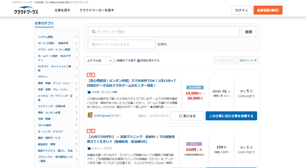 クラウドワークスは医療・健康系を含む幅広い分野の案件が集まる国内最大級のクラウドソーシングサービスです。